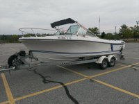 This has a 3.7L 4 cyl mercruiser I/O 165 HP. Fishfinder. 60 gal tank. trim tabs, boat goes about 40 MPH. Selling with a two axle ShoreLand'r galvanized trailer with rollers and surge brakes.